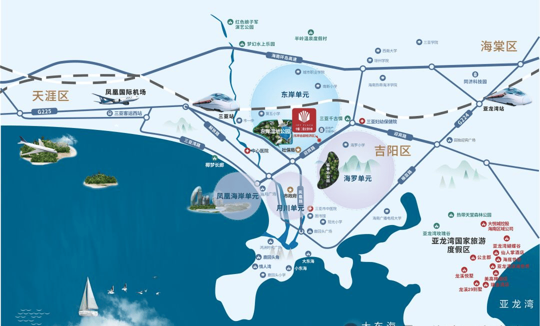 公园配套:东岸湿地公园,金鸡岭桥头公园、临春岭公园。距离凤凰机场约14公里距离三亚高铁站约6公里距离三亚湾约公5里距离亚龙湾约20公里