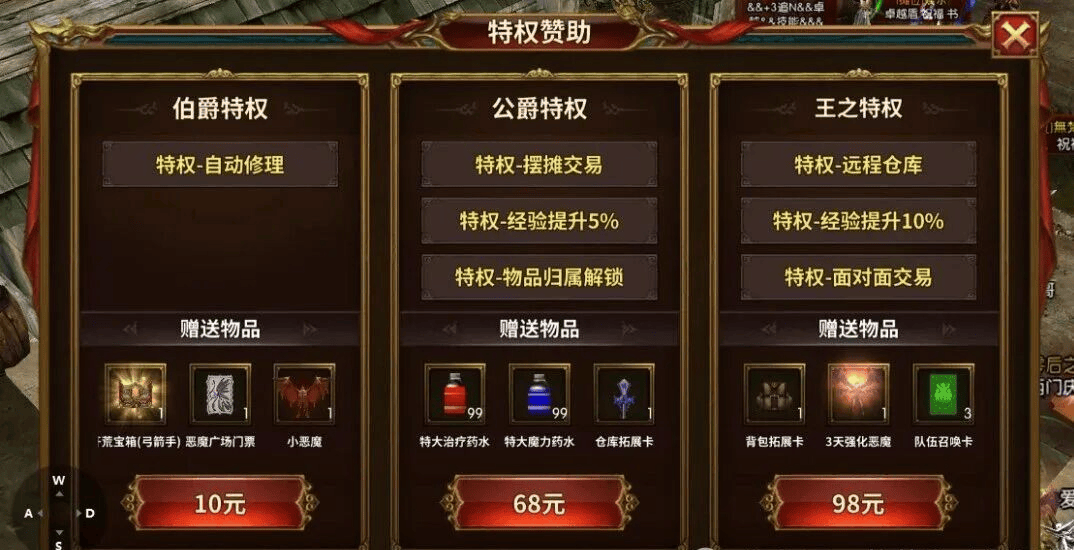 在68元档基础上,新增“远程仓库权限”“10%经验加成(叠加后15%)”及“背包拓展卡”,解决野外刷怪背包告急、往返存取道具的痛点。背包拓展卡单独买需59元,随特权赠送更划算。预算充足可拉满,有限则优先68元档。