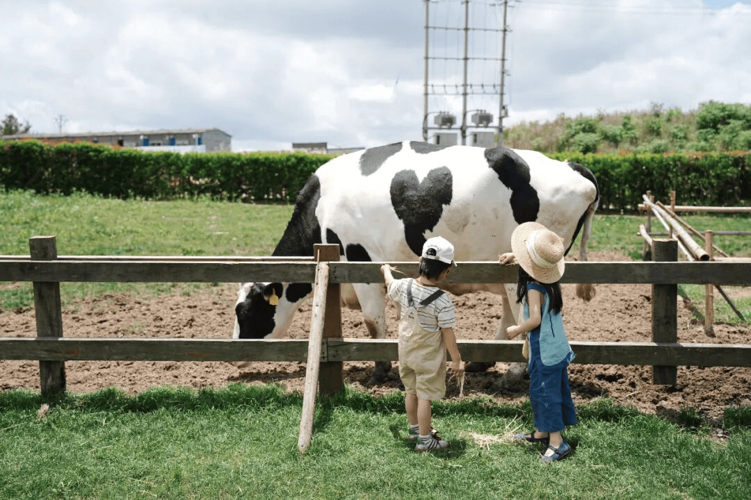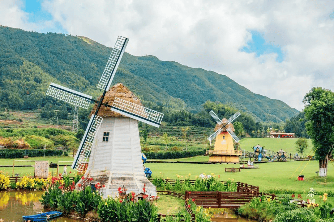 牧场内绿草如茵,成群的奶牛在草地上悠闲踱步,白色的风车、木质的栅栏、彩色的小木屋,构成了一幅童话般的画面。牧场里还有亲子牧场区,设置了滑草、喂小羊、挤牛奶体验等项目,带娃来能玩上大半天。