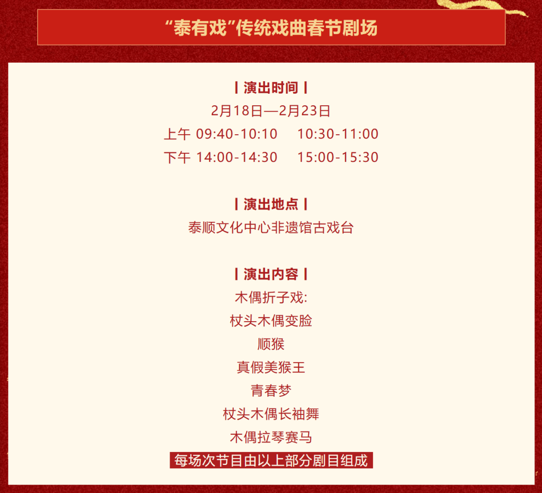 2月18日—2月23日,非遗馆古戏台好戏连台,全家一起看泰顺木偶戏,感受地道年味。具体时间和内容见下图↓↓