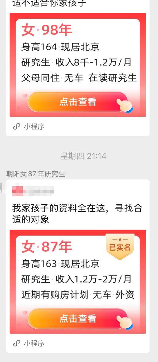 这种现象的本质,是相亲模式的彻底异化。小程序们巧妙地将相亲平台改造成了类似于Boss直聘的“女婿/儿媳直聘”模式。在这个模式下,相亲的当事人(年轻人)被完全悬置,寻找伴侣的过程变成了家长与家长之间的直接谈判。