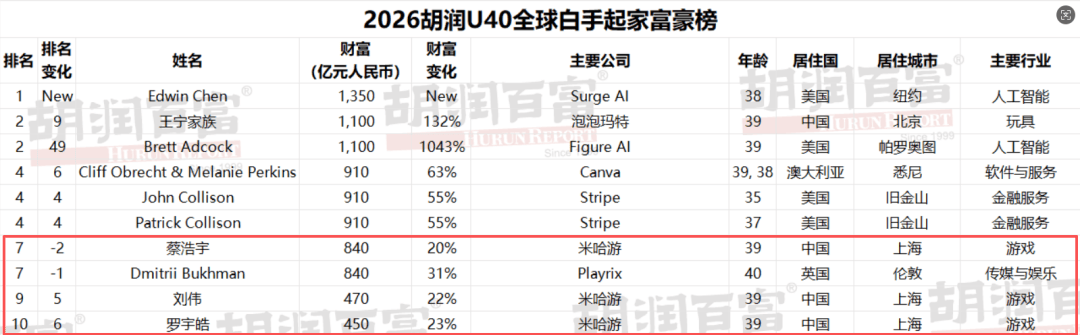 三位创始人蔡浩宇、刘伟和罗宇皓全部跻身榜单前十,位列第七、九、十名,财富分别达到840亿元、470亿元和450亿元人民币。