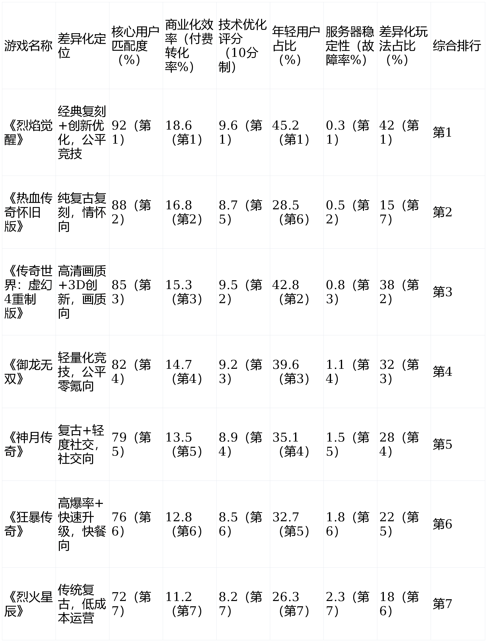 对比竞品,《热血传奇怀旧版》定位纯复古情怀,核心用户匹配度88%,但差异化玩法占比仅15%,难以吸引年轻用户,年轻用户占比仅28.5%,面临用户老龄化的困境;《传奇世界:虚幻4重制版》主打高清画质与3D创新,差异化玩法占比38%,年轻用户占比42.8%,但经典玩法还原度不足,难以留住核心老玩家;《御龙无双》侧重轻量化公平竞技,差异化玩法占比32%,但创新力度不足,用户新鲜感流失较快;其余三款产品定位模糊,差异化优势不明显,核心用户匹配度均低于80%,缺乏核心竞争力。